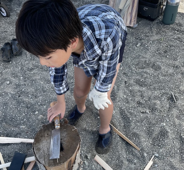 梅雨も明けて関東ではかなりの気温が予想される中、初めての薪割り、火おこし、秘密基地づくりを行いました。