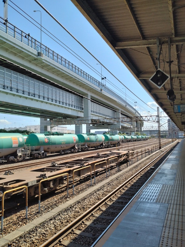 根岸駅構内から眺める、線路、首都高、タンク車の流線型(カーブ)風景は圧巻の一言で、一度機会があれば見る価値が十分にあるのではないだろうか😊。