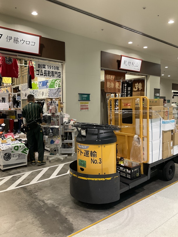 この写真は水産仲卸等の4階の関連物販での光景です。市場の内部はターレーじゃないと不便ですからね。