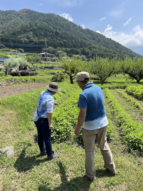 ❷農作物を活かして手づくりすることの楽しさ、豊かさ畑に来て、育っている藍に直接触れながら、その色で染める。
