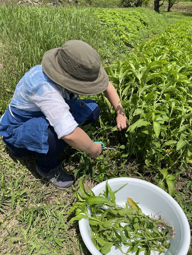 ②自分で藍の葉を収穫する当日染める直前に、藍の葉を収穫する工程も体験できます。