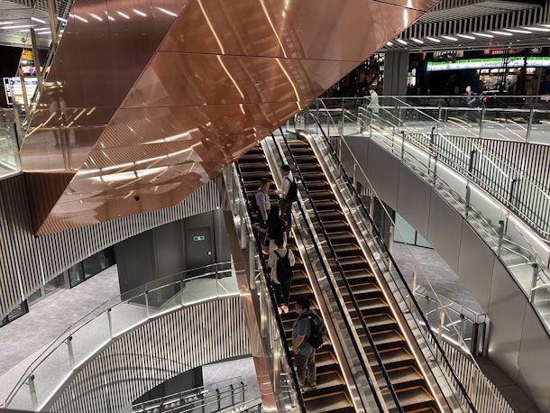 この夏、サクラステージが動きだし、まだ地図にはない空中回廊と呼ぶことのできるルートができていることに気づきました。銀座線の屋根の上を通って、ヒカリエから渋谷駅、マークシティをつなぐルートをスカイウエイと名付けて2027年度めざして工事中であることは発表されています。しかし、その完成を待つことなく、ヒカリエからマークシティまでの空中回廊が、サクラステージを迂回することで実現しているのです。