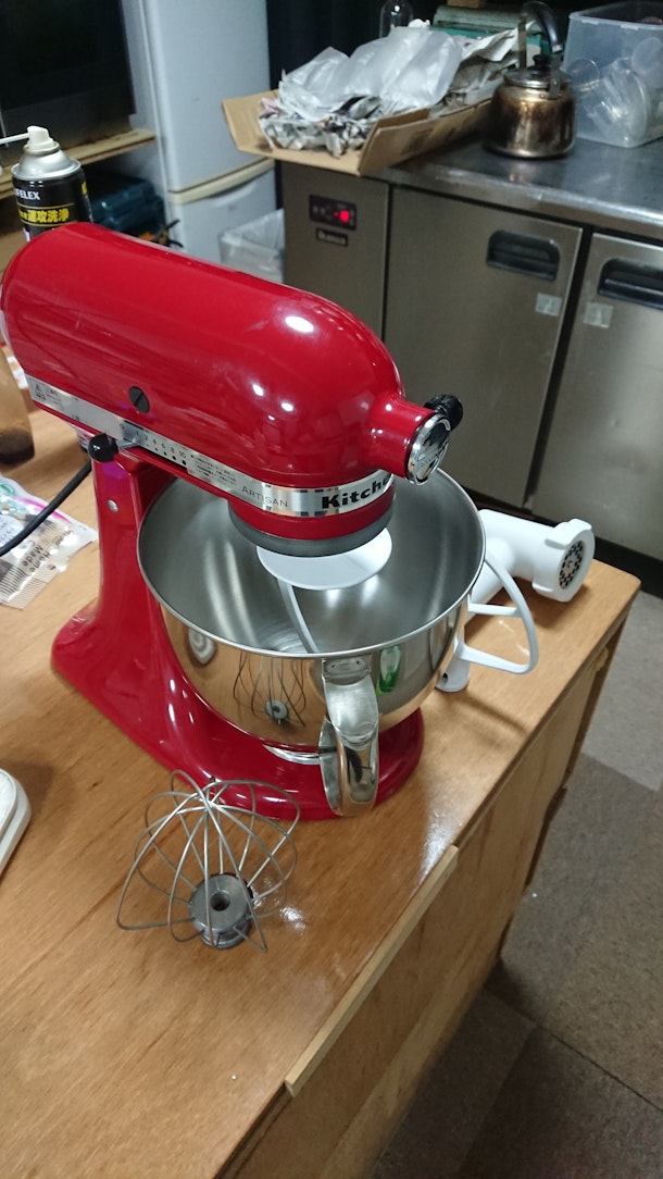 こんにちは。キッチンエイドという機械を買いました。ハンドミキサーの親分みたいな道具です。お店の機械みたいに先端がフック型になっていてパンをこねるのが得意のようなので次回のパンを焼く会が楽しみです。まだ日程は決めていないけど。あと、切れ味の良さそうなミンサーがついているので、ブロック肉から挽肉を作るのも楽しみ。赤身でハンバーグとか作ってみたい。みなさんはこれで何をしてみたいですか?ということでコメントよろしくお願いします。