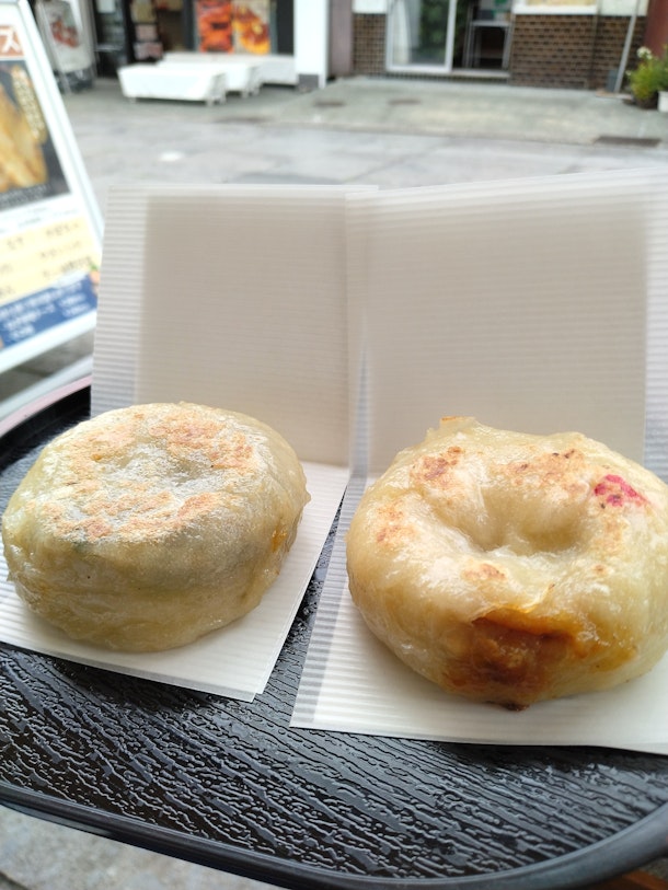 長野と言えばおやき⁉左は野沢菜、右はみそチーズ。具の塩味と皮のもちもち感が相まって無茶苦茶美味い。