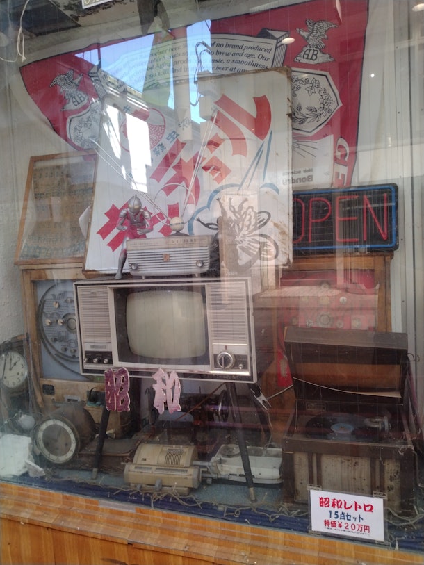 例えば、お店のウインドーにとてつもなく古いテレビが飾られていたり、魅惑⁉の人参詰め放題100円のお店があったり、大量のビックリマンシールを貼った謎のお店があったり、ある意味⁉他の追随を許さない完璧な昭和⁉商店街なのである。
