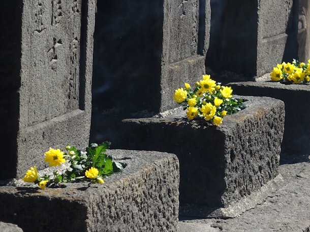 お線香のよい香りが漂って、菊の花やお酒も供えられていました。外国人もお参りしていました!
