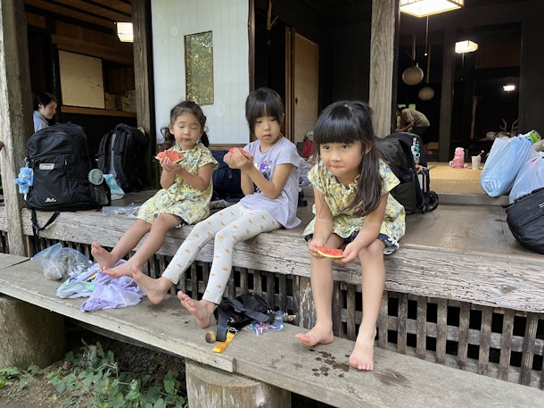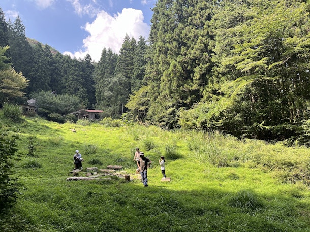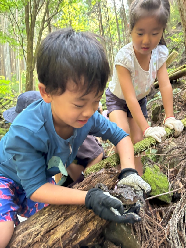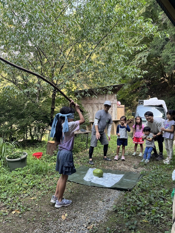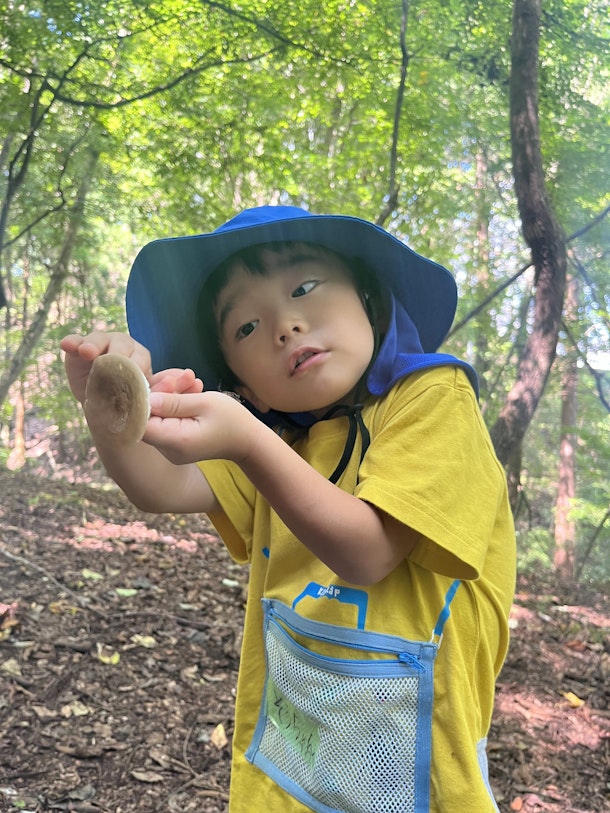 きのこのこのこキャンプには数回目の参加です。憧れの檜原村での開催、車がないと諦めるところでしたが、今回駅から送迎バスが用意され、参加する事ができました! 9月頭、都内は30度超えの蒸し暑さでしたが、バスはぐんぐん山道を登り到着した檜原村の古民家には涼しい風が吹いていました。森を散策して気になったものを集めて観察しお昼ご飯を食べ、川のお手入れをしました。 いつも私は作ったり学んだりのワークでやる事にのめりこんでしまうのですが、今回は森で地面を見つめ色付きつつある木の葉や実を見つけたり、川の水が冷たなど、その場でじんわり感じる事を多くやった印象でした。何もしてないのに心地よくて、季節が動いていく森や川の様子を堪能できた貴重な時間でした。娘もワークそっちのけで森と渓谷で楽しそうに遊んでいました。 川のお手入れで完全に整った後、皆でスイカ割りをして大盛上りしました。代表のゆうこさんの言う「キャンプの時はゆるい家族」に想いをはせ、泣けてきました。スタッフの皆様、参加した皆様、楽しい時間をありがとうございました。 きのこのこのこキャンプは毎回、季節やテーマ毎に「やってみなければ分からなかった事」の驚きが多く、よい意味で「思ってたのと違う!」となり、毎回行けてよかったなと感じます。そして皆が好きなことをしてるので、飽きるのが早い娘も気の向くままに、生き生きしています。親子で遊びたい方にオススメですが、テーマによっては1人で世界観に入り浸りたくなるなで、ソロ参加もよいなと思います。