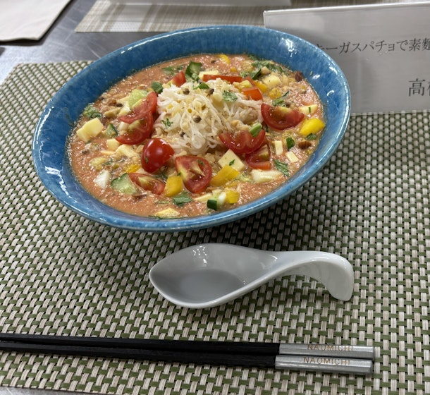 ミルキーガスパチョde素麺です。 辛味が特徴だけど牛乳がマイルドにしてくれていて、辛いの苦手な方も大丈夫!との感想をいただきました。 残念ながら、その上の関東大会の出場権は得られなかったのですが、他の出場者の方の手際の良さとか発想とか、勉強になる大会でした。 頑張って開発したので、野菜たっぷりなので、肉の会や野菜の会や洋風っぽい料理教室でお出ししていこうと思っています。 (お腹にたまる素麺は無くていいかも)