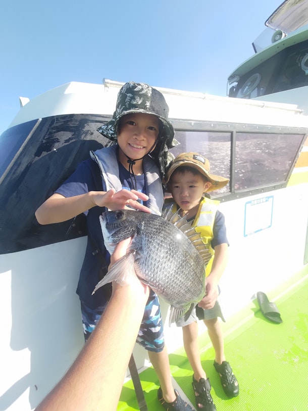 子どもは懸命に持とうとしますが、クロダイはパワーが強いので、だいたい諦めます。(笑)アジはなんとか持てる子が多い