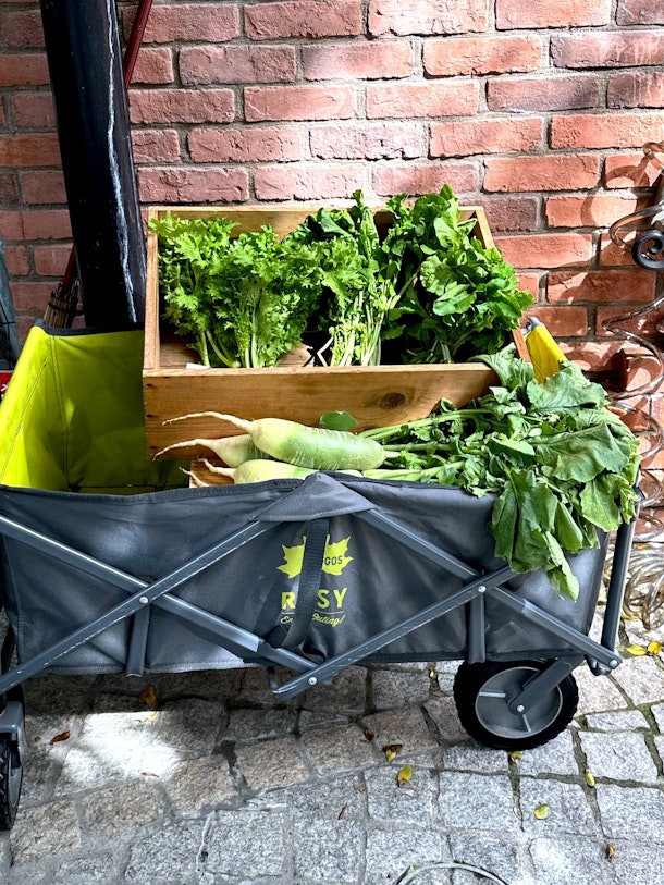 昨日開催のツアーでもいくつもの楽しいサプライズがありました。 こちらはカフェのテラスで週末に開催されている野菜マルシェ。
