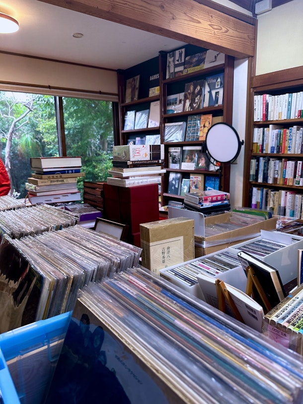 懐かしさを感じる書籍、LPレコード。開店の支度中のところおじゃましました。