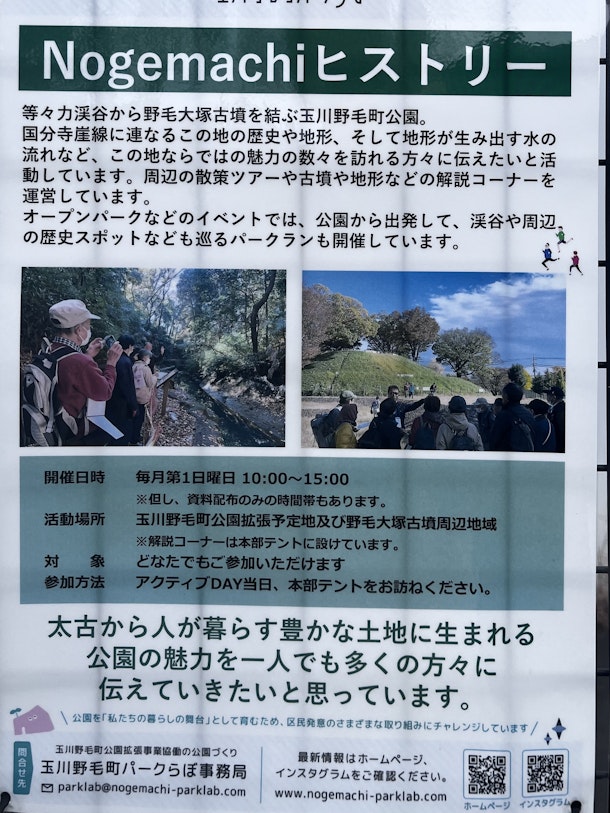 野毛大塚古墳がある玉川野毛町公園の拡張工事が進んでいます。工事の合間を縫って、地元区民がチームを作って拡張公園開園後の数々の活動の企画準備をしています。等々力渓谷案内人、ましゃえもんはNogemachiヒストリーというチームを作って、野毛大塚古墳、等々力渓谷周辺の歴史文化財解説、地形の面白さを解説しています。この拡張予定地は、普段は閉まっていますが、毎月第一、第三日曜日と第二木曜日、午前10時〜3時に入場できます。Nogemachiヒストリーチームは周辺各所のパンフレット、国分寺崖線散歩マップ等、周辺散歩に欠かせない資料を取り揃えてスタンバイしています。ご質問ご要望あればお答えしています。この日この時間、野毛公園拡張予定地に訪れてみて下さい。
