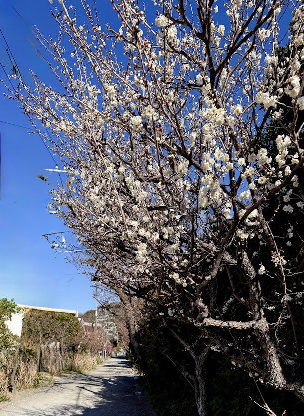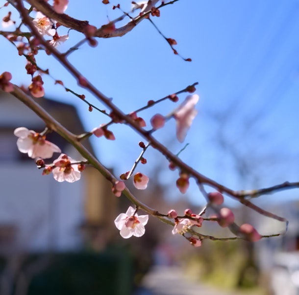 寒さの中で春の気配を伝える梅の花。路地裏カフェ散策に彩りが加わります。