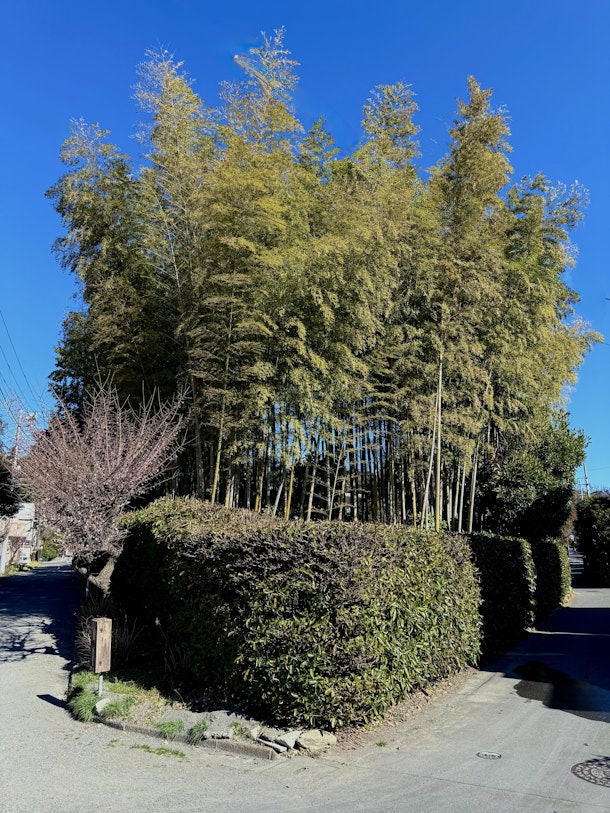 中ほどの竹の生け垣近くにも梅が開花。竹の緑とのコントラストが美しいです。