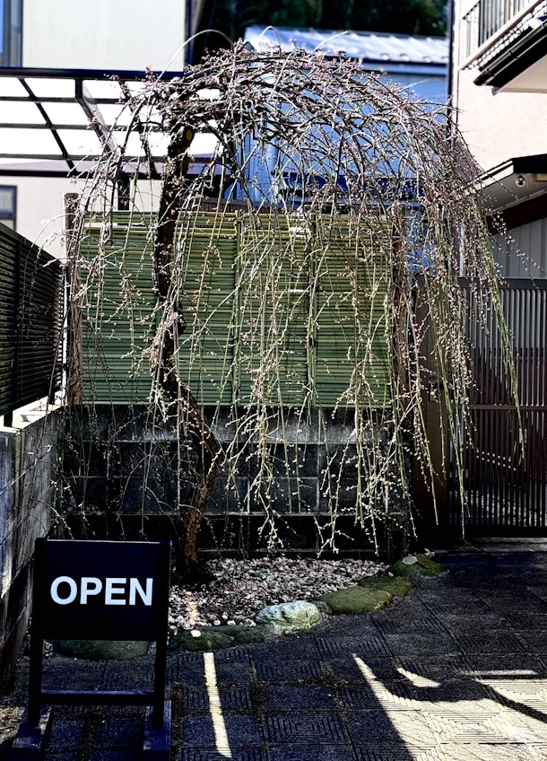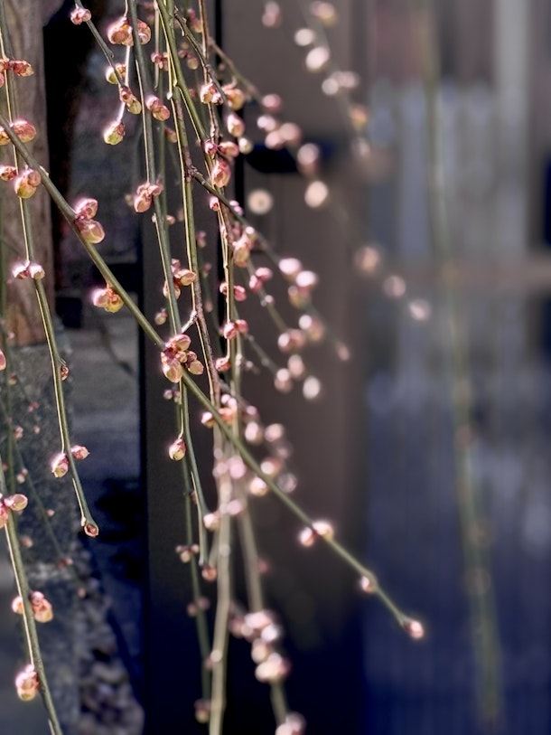 鎌倉路地裏カフェ散歩(山裾の道)でよく訪れるカフェの前、しだれ梅も蕾が大きくなっていました。