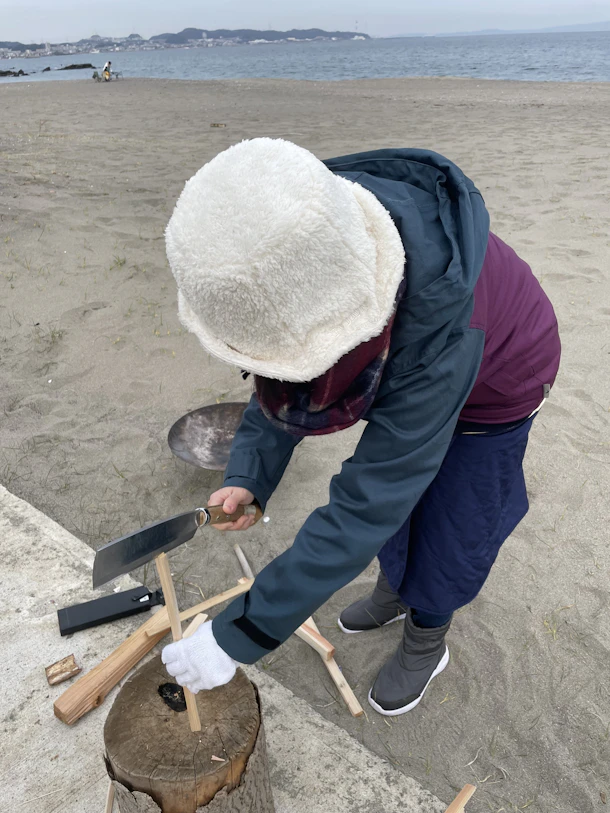 ほとんど使ったことの無いナタを使い薪割りをしたり、フェザースティックづくりに興味を持ったりと大奮闘。