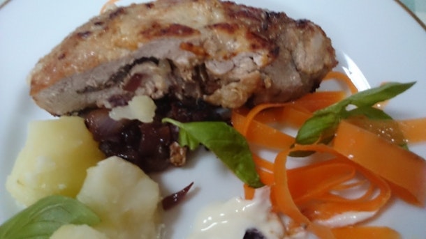 ③豚チョップ、リンゴンベリージャムのフィリングで