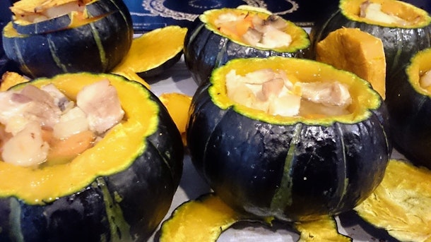 ①赤ワイン入りコンポート ②かぼちゃで作るスープ
