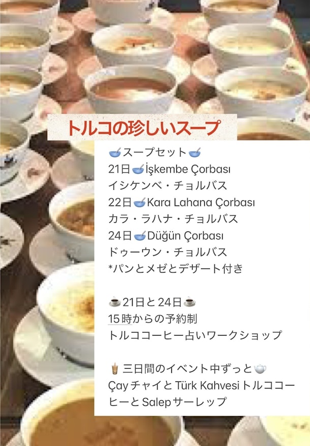 2月21-22-24日のイベントでトルコの珍しいスープを出します。トルコの飲み物や、トルココーヒー占いワークショップなどもあります。