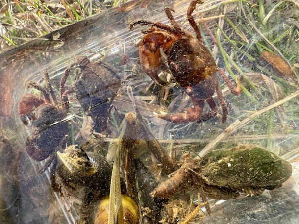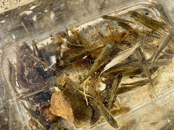 午前中はコジュケイという野鳥が警戒音を出して木の上で鳴いているところを見たり、石の下でじっとしている魚をたくさん捕まえたり、ヨシノボリ・シマドジョウ・モツゴが見れました✨ エビはすでにたくさんでした!虫かごの中は結構いっぱいでした😊
