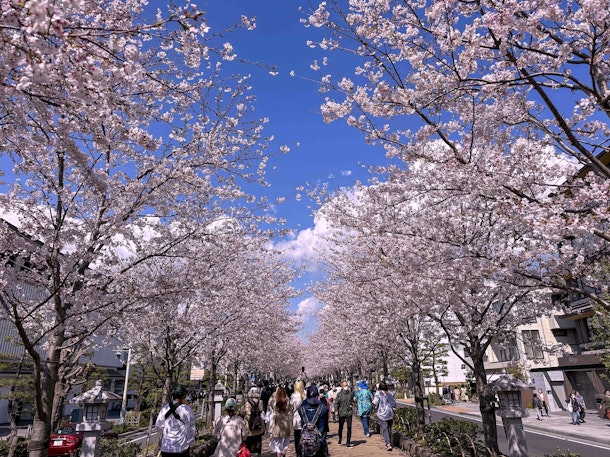 カフェツアーでも桜の時期にマッチしたことがあります。これは2019年4月6日の回の清泉小学校前。満開の桜の下を進む素敵なツアーとなりました。