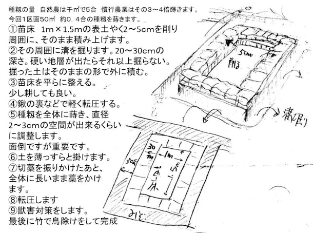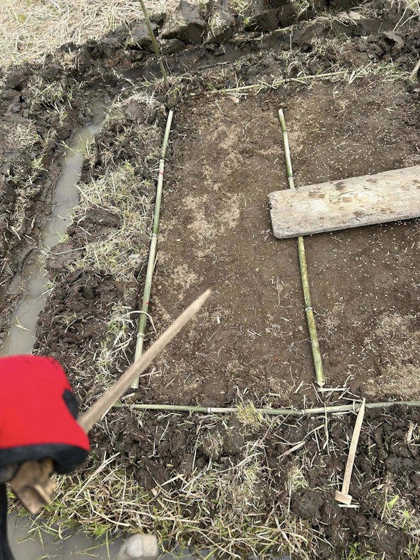 ➁苗床の周辺にモグラ対策の溝を掘ります。