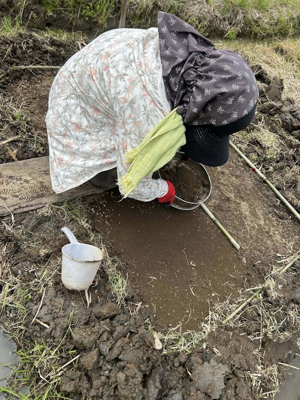 ⑥振るいで 覆土作業。 うっすらと隠れる程度に 振りかけます。