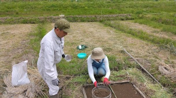 軽く耕して 平らに整え、軽く転圧します。 (耕さず覆土用の土を入れ平らに整えました)