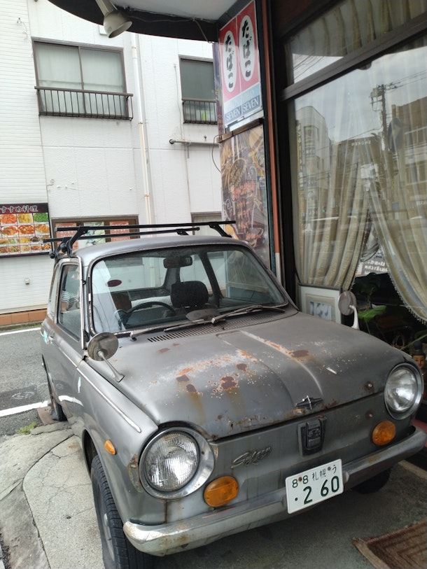 お店の前にはレトロすぎる車が・・・。