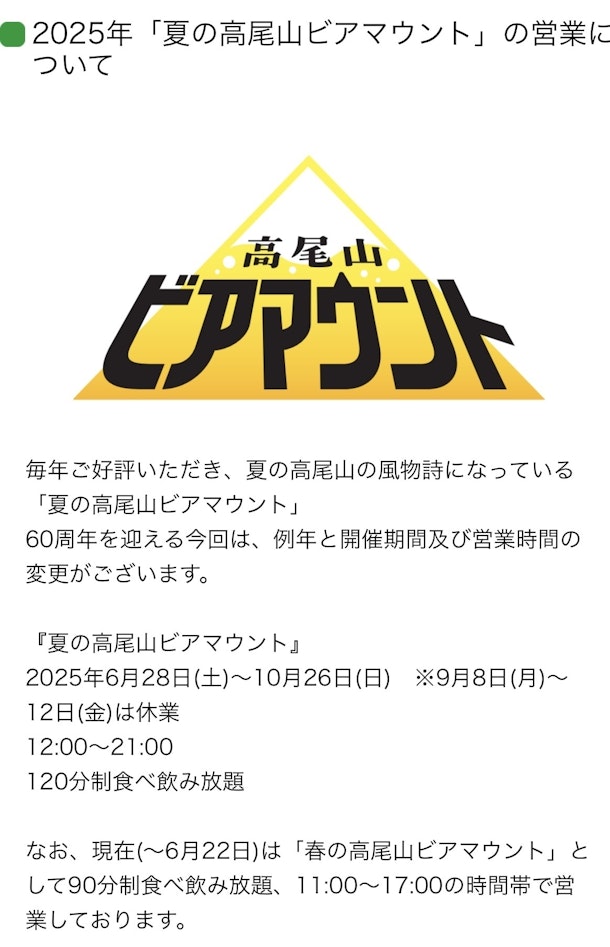 2025年の高尾ビアマウントは6/28(土)〜10/26(日)と決定されました‼️ つまりこの期間はケーブルカーが21:00くらいまで動きます✨