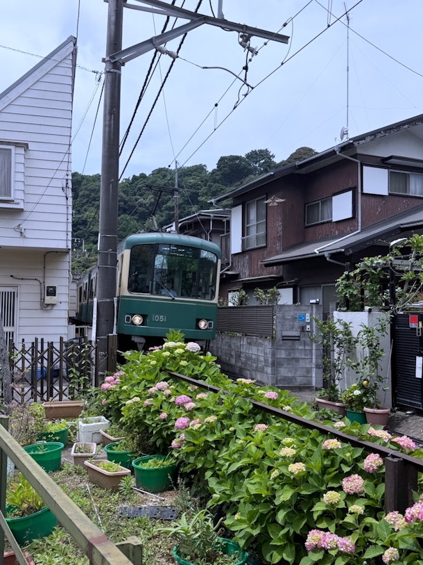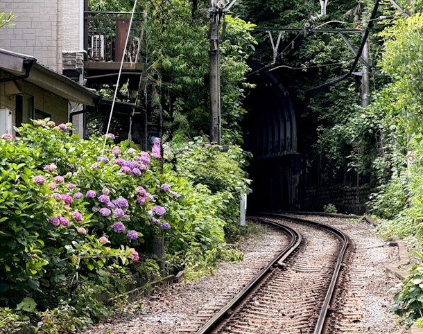 そして長谷に続く江ノ電沿いの道でも、 線路のそばに咲く紫陽花が、道行く人の目を楽しませていました。