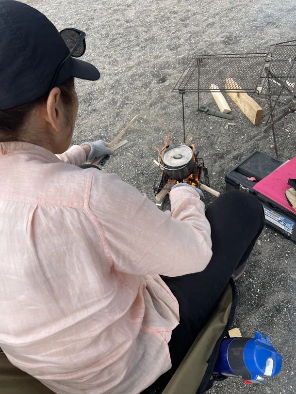 焚き火でのラーメンもお二人ともスムーズ。