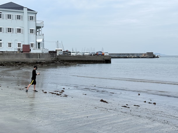 ▼やや蒸し暑かったのと干潮で遠浅なので、浜に入って釣りをしました。