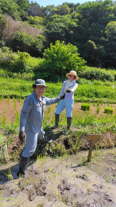 田んぼの学校お田植え後 管理人は 一番下の田んぼにお田植え。
