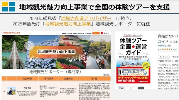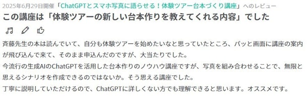斉藤先生の本は読んでいて、自分も体験ツアーを始めたいなと思っていたところ、パッと画面に講座の案内が飛び込んで来て、そのまま申込んだのですが、大当たりでした。 今流行の生成AIのChatGPTを活用した台本作りのノウハウ講座ですが、写真を組み合わせることで、無限と思えるシナリオを作成できるのではないか。そう思える講座でした。 丁寧に説明していただけるので、ChatGPTに詳しくない方でも理解できると思います。オススメです。