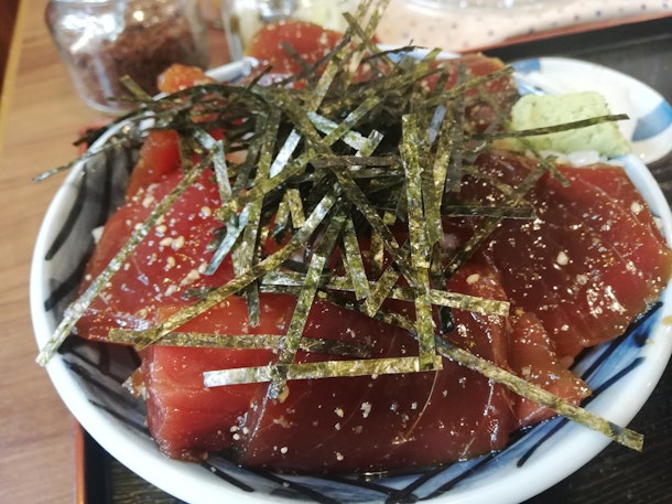 ひもの屋さんがやってるめしやのランチ。日替わりランチや刺身定食など中身が変わります。この日はインドマグロのづけ丼!