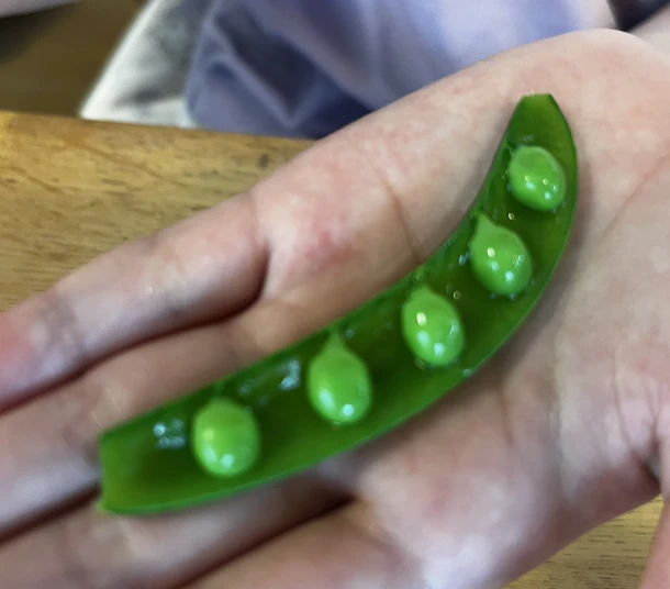▼スナップエンドウを開くと、それぞれの皮に一個置きに種がついてる?!