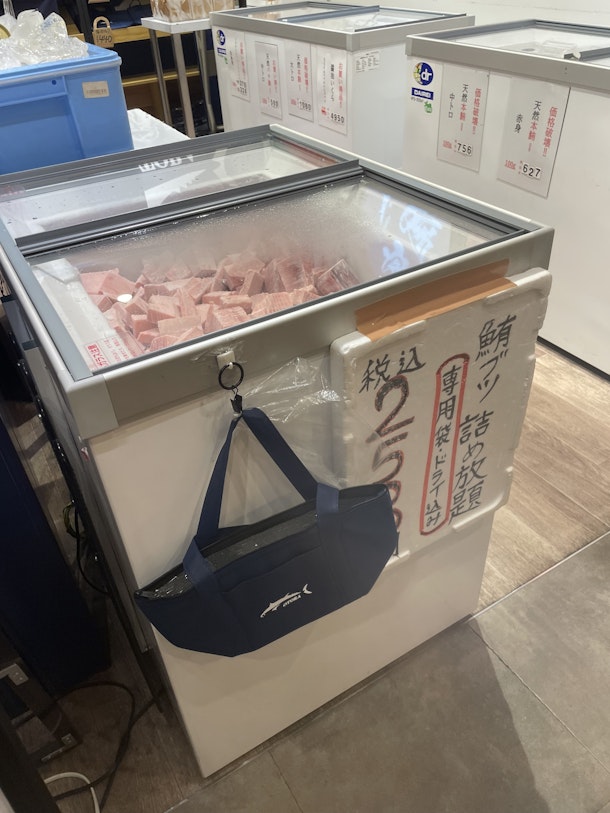冷凍マグロブツ入れ放題。なんと袋と、ドライアイス込で2500円なら安そうですね。