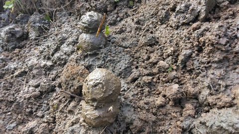 猪に崩された土手。 以前は あ~~ 直さなければ。 と思うだけだった。 今。 を! 良い粘土じゃん。ありがとう!! 猪が土手を崩す。 ミネラルを海へ送る。 川が浅くなり 大雨で氾濫する。 色々環境が変わっていく。 里山が崩れて 自然に戻っていく。 多様性になる。 良いことだよね。 獣が増え 獣をいただくことも増える。 と 楽しく考えたら 泥団子でダルマ作ってみた。 たくさん並べたら面白いよね~~。 結界!