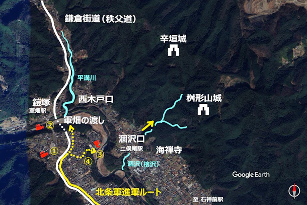 【地図】北条軍推定進軍・渡河ルート