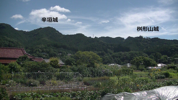 【地図上の番号①】軍畑大橋南交差点から氏照本陣(推定・手前の畑地)と辛垣城・桝形山城を望む