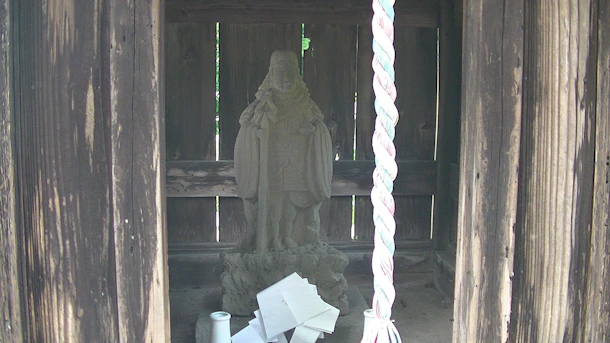 【番号④】木ノ下八幡神社(由緒不明)―八幡神は軍神。小祠にしては立派過ぎる御神像(渡河の成功を祈願か?)