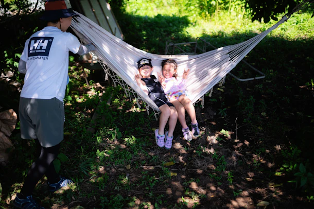 お昼後のゆっくりタイムにみんなのお気に入りのハンモックでは、「私もやりたい!」「いいよ、交代するね!」という微笑ましい様子も見られました。