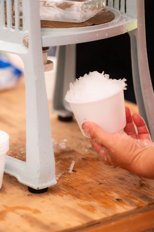 帰ってきたら、昔ながらの手動かき氷機で作ったかき氷をみんなで堪能。 ブルーベリーをトッピングする子もいて、オリジナルの味を楽しんでいました。