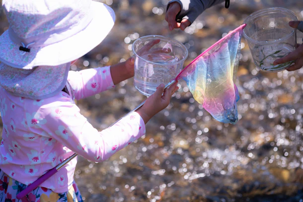 暑い日差しの中、冷たい川の水が気持ちいい! 網を使ってガサガサ体験。カニやヤゴ、川エビなど、たくさんの生き物を発見し、専門のスタッフから名前を教わります。 透明カップに入れて観察することで、より自然への興味が深まっていきました。