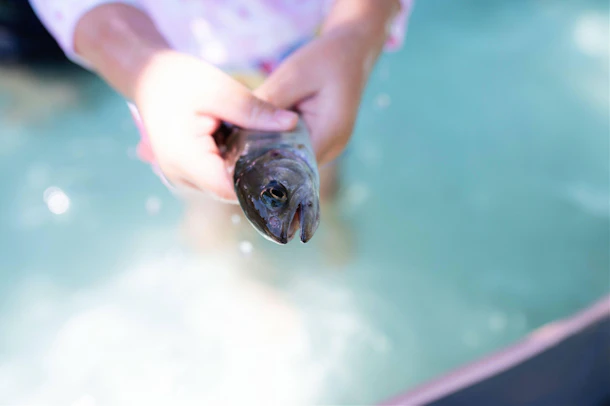 すでにプールにはヤマメが放たれており、子どもたちは大興奮! すぐに手を伸ばす子、じっと観察して動きを追う子、それぞれのやり方でヤマメと向き合っていました。