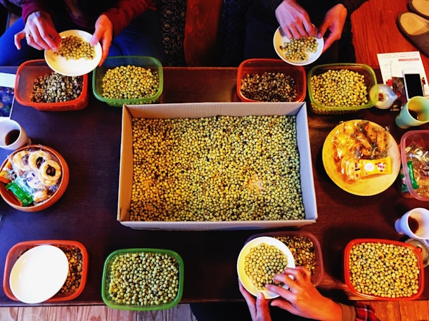 鞘から外した豆を、よい豆と虫くいの豆とに手作業で一粒一粒分けていく作業です。