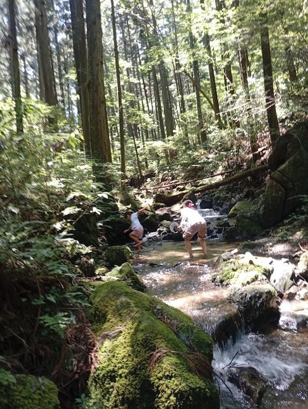 この夏も行っているぼくの沢遊び体験では 冷たい沢の水に足を入れたり 沢ガニを探したり おいしい湧き水を飲んでもらったりしますが 食べられる葉っぱを味見してみたり 転んで血が出た時に使うとすぐ血が止まる薬草を 知ったり実際に使ってみたり いい香りのする植物のいろいろや 沢の水音の面白い聴き方を知ったり 五感を使って自然を深く楽しく味わったり いろいろなことをしますが 体験後にお母さんが 「今日何がいちばん楽しかった?」と聞くと 「沢登り!」と答える子がとても多いです。 沢登りとは、沢を上流に向かって登っていく遊びで 自然のフィールドアスレチックのような感じで プチ岩登りをする場所もあります。 沢の水の深さや岩を乗り越えていく難易度が この場所は絶妙によくて 下りは林道に出て戻ってもらえれば 安全に楽しむことができます。 林道からスタート地点に戻ってまた何周も 繰り返す子もいたりして(最高8周!) 短くない距離なのに、すごいなあと感心します。 最初はぎこちない登り方だった子供たちも からだの使い方が自然と上手になっていって がしがし登るようになっていきます。 写真左の女の子は、今年4月に来て また7月にも来てくれて 他の家族たちから 「あの女の子すごいですね!」と言われるくらい 力強く沢を登って男の子も抜いて 沢登りを何周も遊んでいました。 4月に来た時には、沢登りは恐る恐るで とってもおぼつかない足取りがったのが だんだん上手になり お母さんによると 「自然の中での色々な経験が、 少しずつ娘の自信につながっているようです。」 とのことでした。 ぼくのノートのひとつ前の投稿で がっしりヘビを掴んでいるのが この春はおとなしくまだ自信なさげだった 女の子です。 3か月後の成長にも目を見張りましたが いろいろな子がその1日の数時間で たくましく元気になっていくのを 毎回目の当たりにしてうれしく思っています。