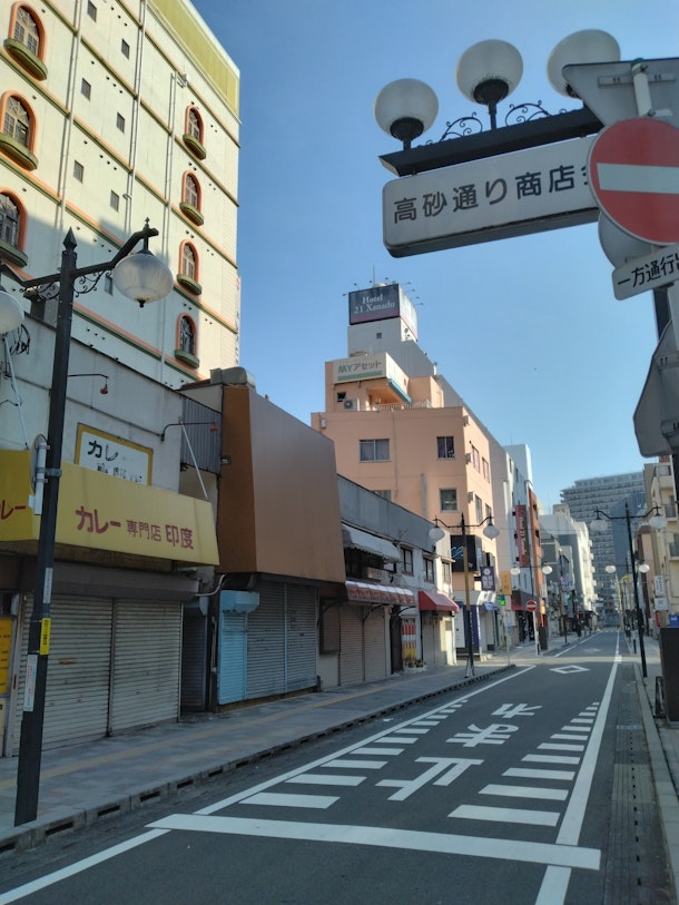駅近くの高砂通り商店街。個性的な飲食店が多く存在する。
