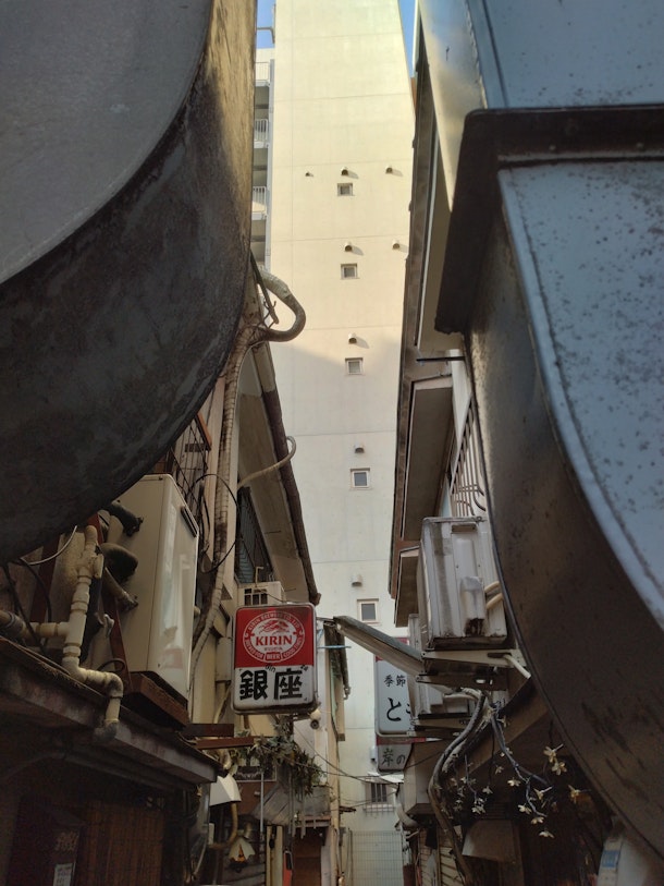 横丁の後方には何とも言えないヨーロッパ風⁉の建物(1階はパチンコ屋)があり、街景色のアンバランス感が逆に横丁の昭和レトロ感を引き立てている。
